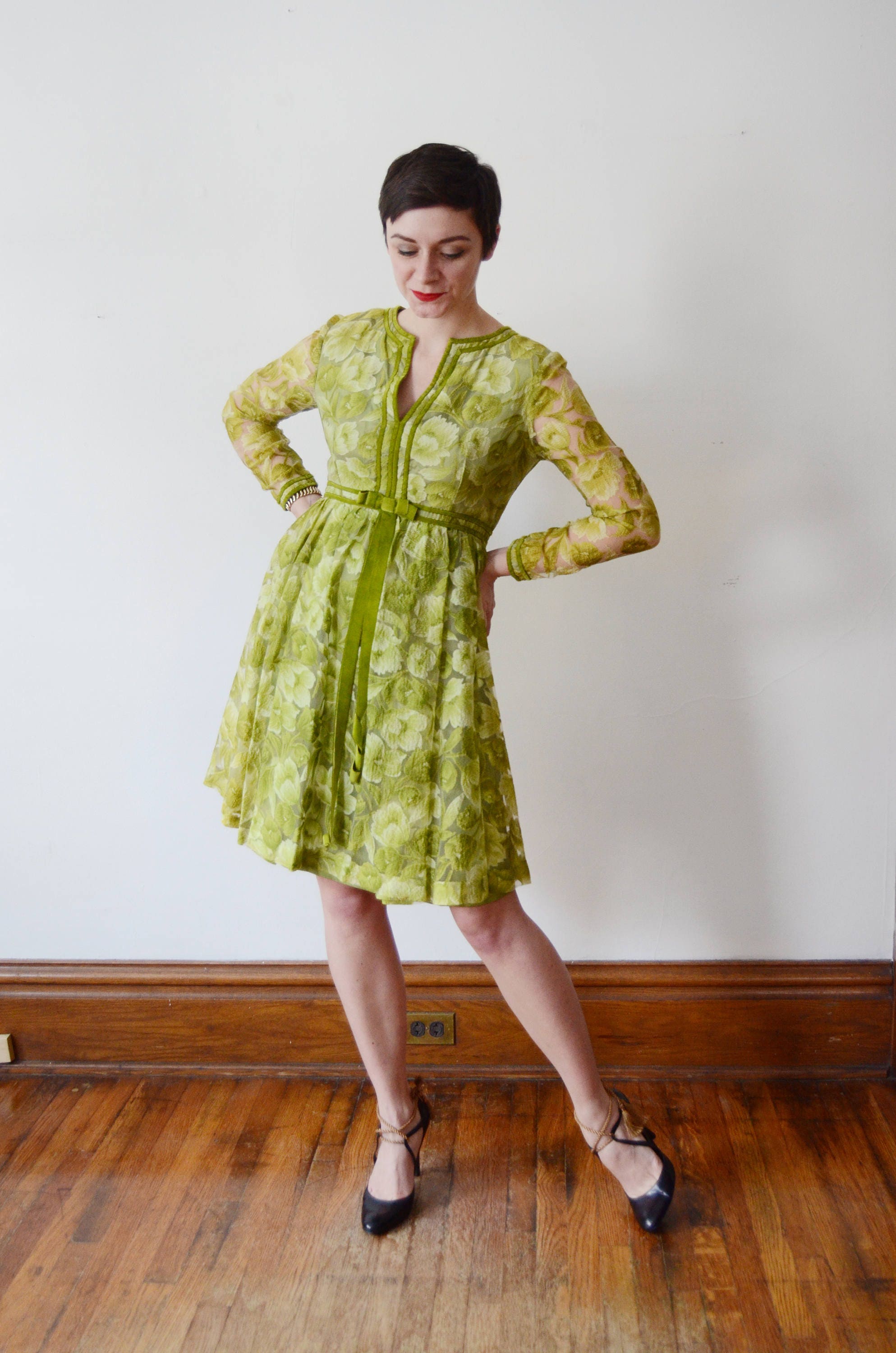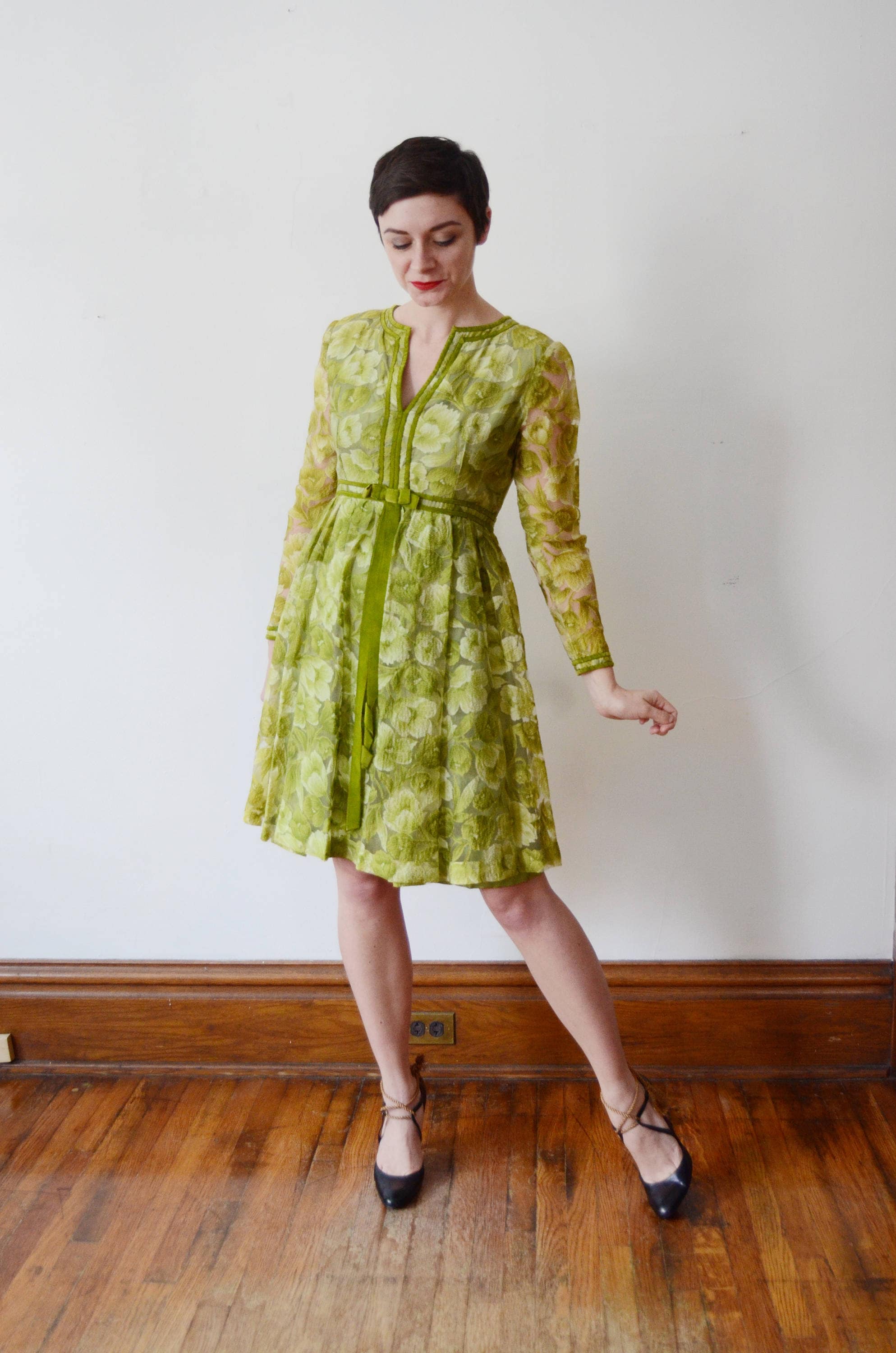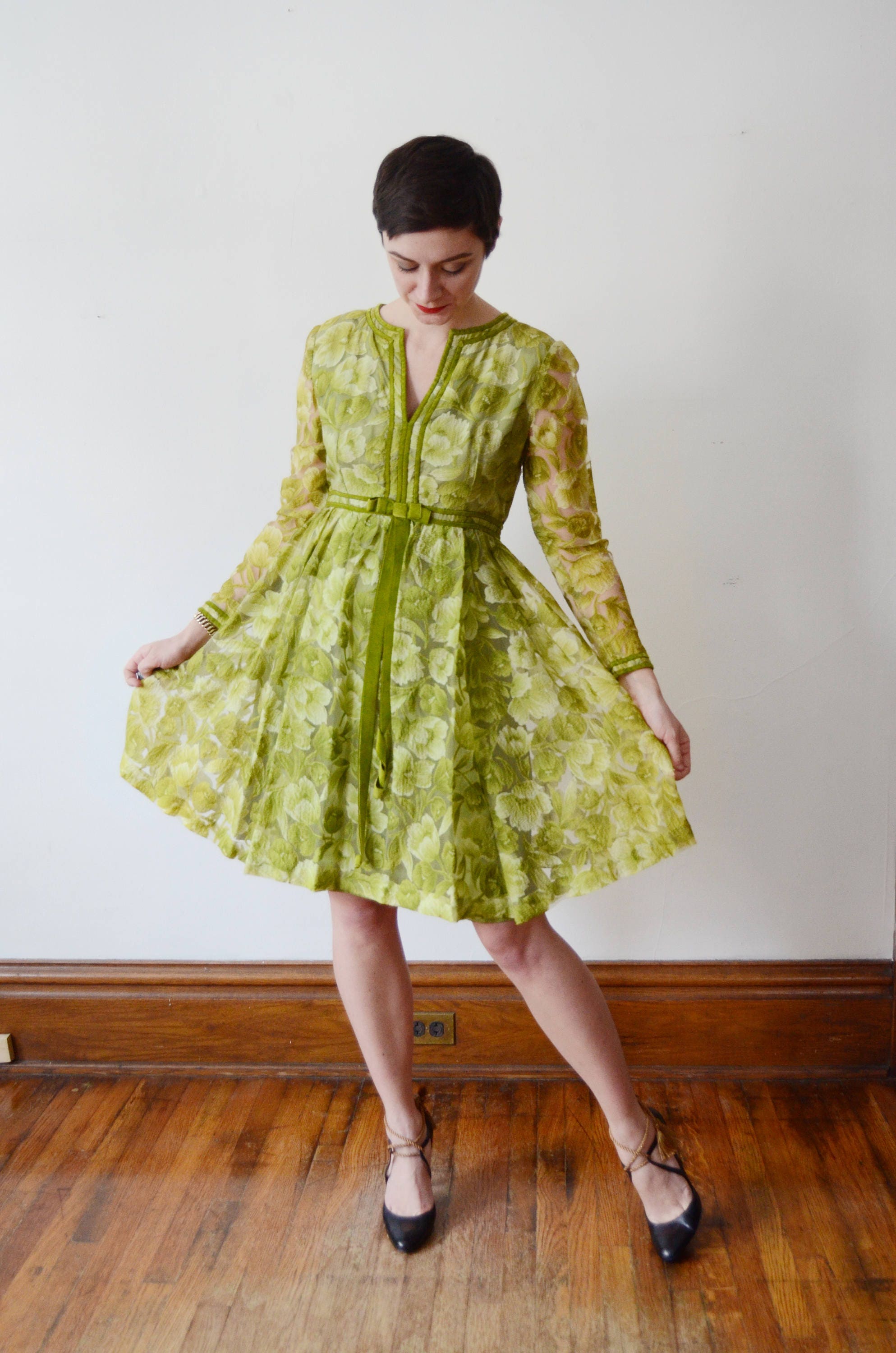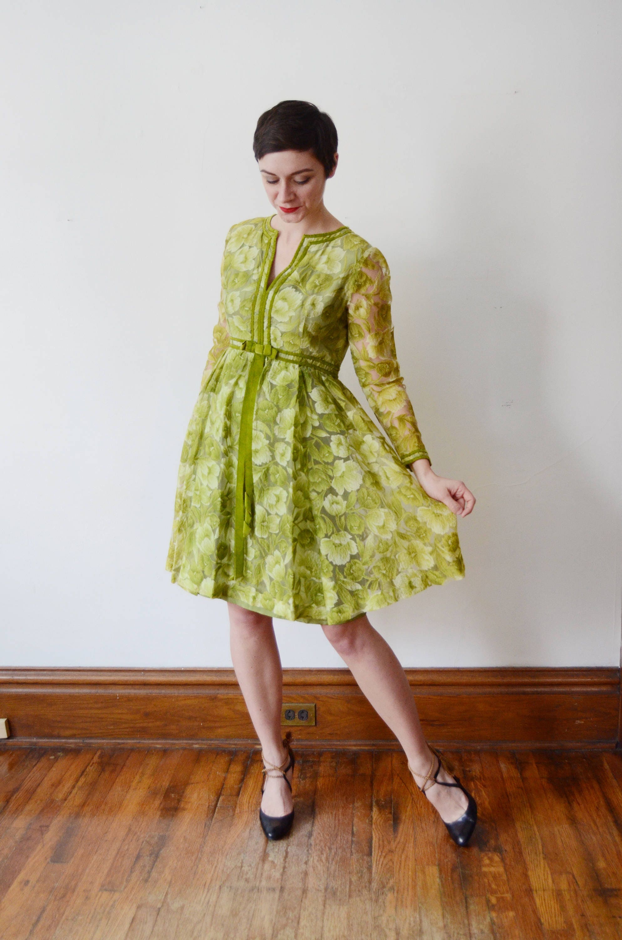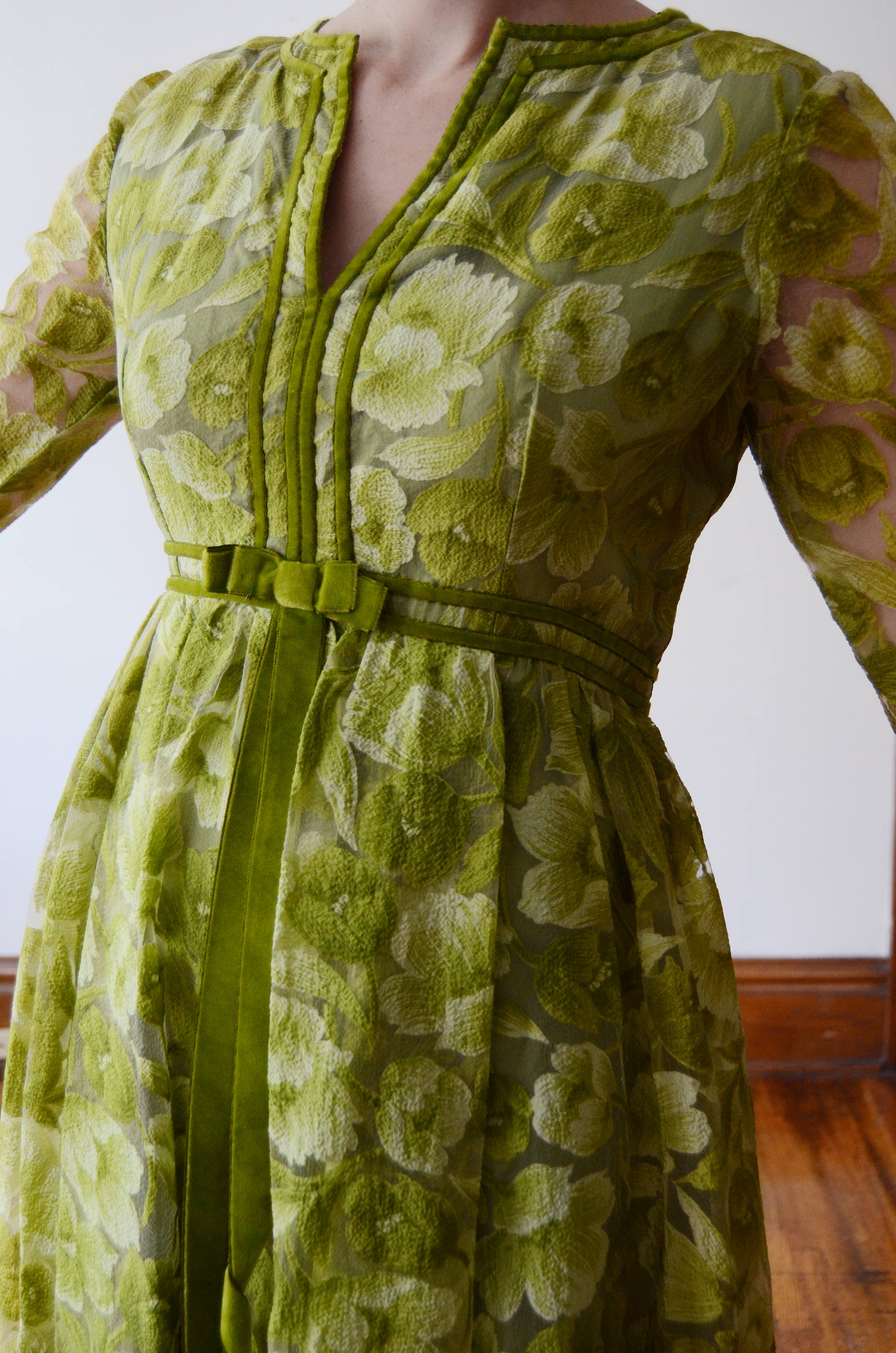 Description: The most darling green floral mini dress with a long velvet bow down the front. Zips up the back with a nylon zipper, and the long sleeves are sheer.