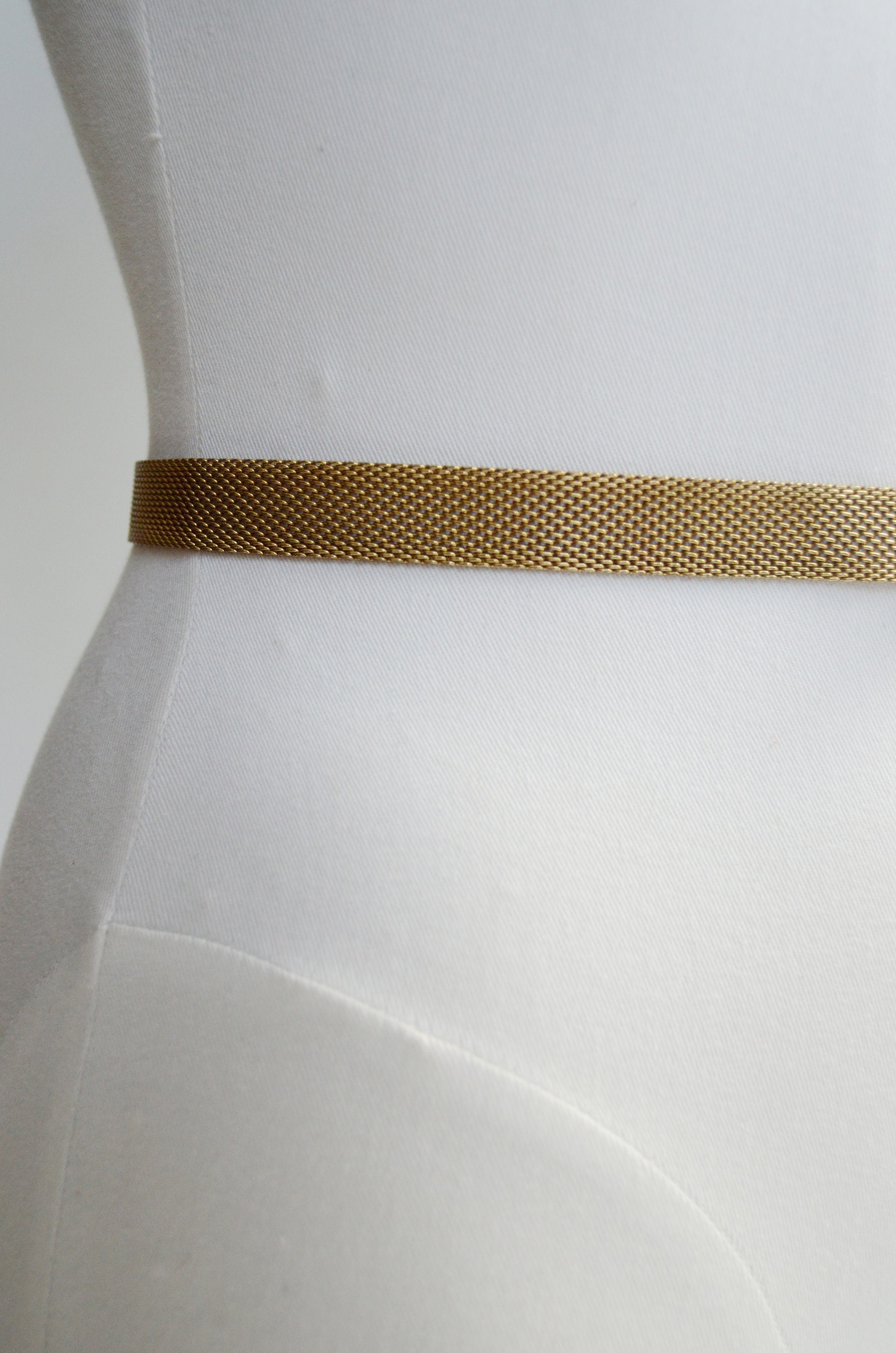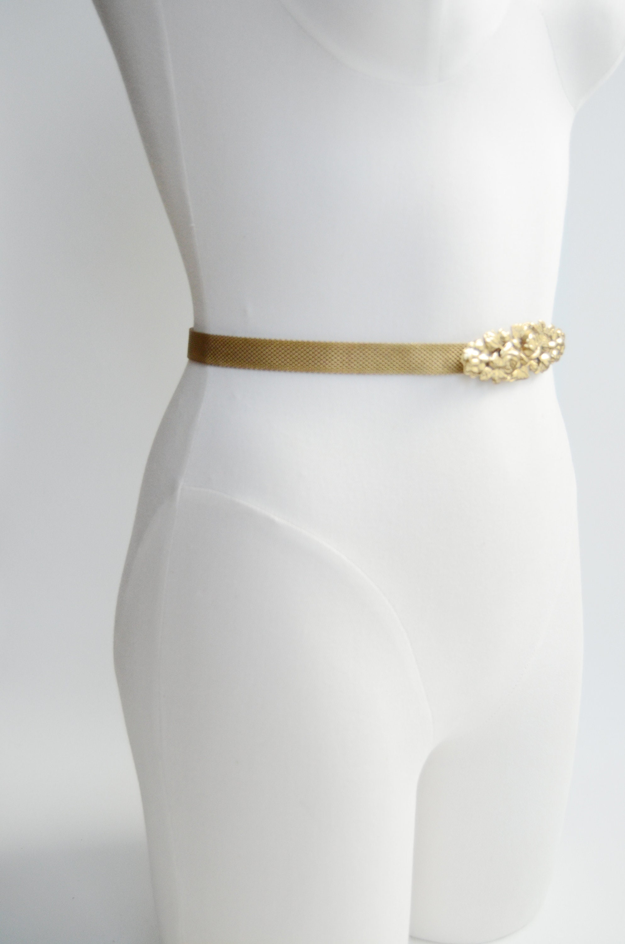 Skinny mesh band with a metal rose belt buckle. Measures 32” around and is not stretchy.