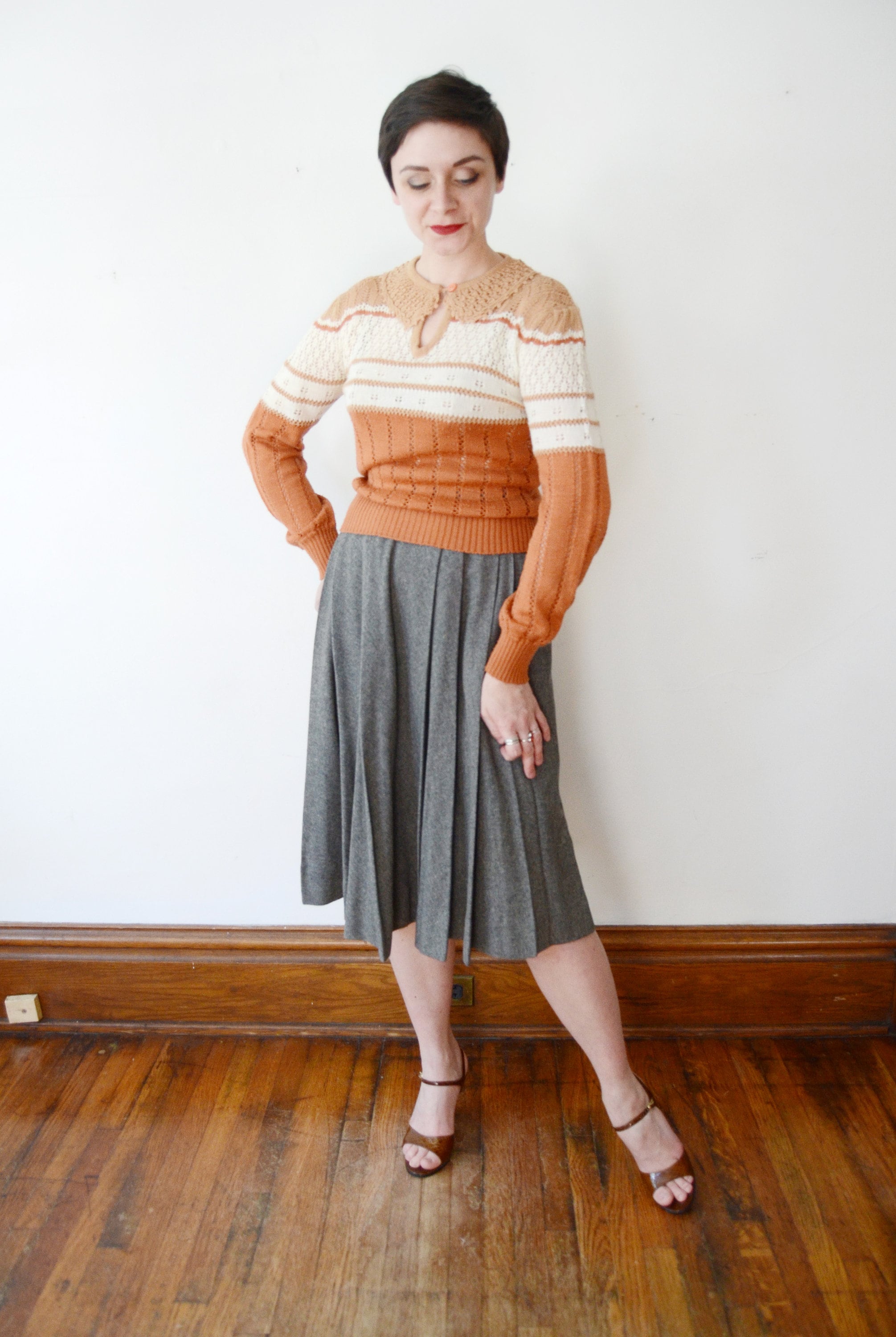 Description: Lightweight knit sweater with a sweet little collar and one button at the neck .